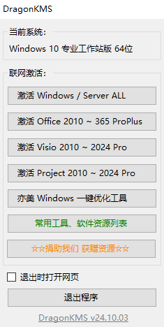 目前DragonKMS(MicroKMS)神龙版能激活Win11、Win10、Win8/8.1、Win7以及Win Server 2025/2022/2019/2016/2012/2008等系统版本,其中包括:专业工作站版、企业版、专业版、教育版、专业教育版、家庭版、核心版、中文版(OEM预装系统版本)、单语言版等,同时支持激活Office 365/2024/2021/2019/2016/2013/2010 Proplus、Visio 2024/2021/2019/2016/2013/2010 Pro、Project 2024/2021/2019/2016/2013/2010 Pro。